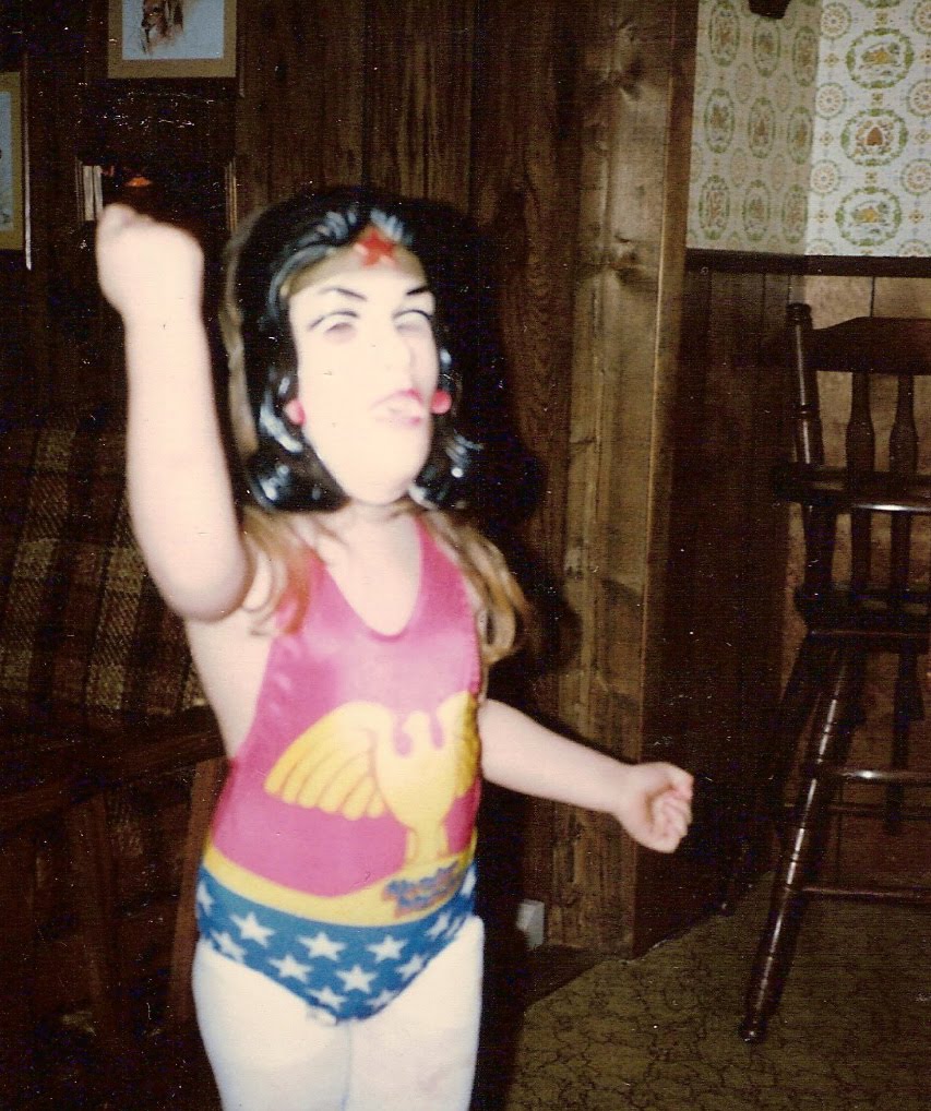 “No, it wasn’t Halloween. I thought I was Wonder Woman so I wore my Wonder Woman bathing suit at all times. I even wore it under my clothes. At a Girl Scout ceremony, I went into a bathroom and stripped off my regular clothes. Then I ran up and down the aisles yelling ‘Wonder Woman, Cha-ching, Cha-ching’ until my Mom caught me. She told me I could do that all over the house but should refrain in public. Superheroes should never reveal their identity to a crowd.”