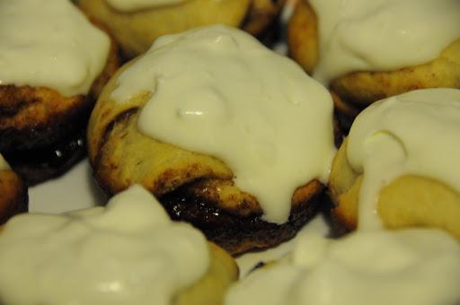 So I decided to try this recipe again. This time, I decided to roll the cinnamon rolls like crescent rolls. I wasn’t going to waste my time trying to roll out an elastic dough. Once I rolled them into crescent form, I put them into a muffin pan sprayed with non-stick spray. I figured in the muffin pan they would hold shape and keep the cinnamon mixture inside the roll. This worked perfectly. The rolls maintained their shape, kept all of the cinnamon mixture and they tasted great. I put the cream cheese mixture in the fridge while the rolls were baking so it would be nice and cool on the fresh cinnamon rolls. I do recommend eating the rolls while they are still warm if you are looking for that Cinnabun taste.
