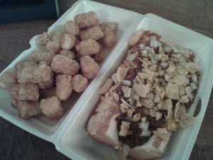 The Little Leaguer was in no way shape or form a little hot dog. With the Sweet Hawaiian bread bun and the massive dog in the middle, that would have been meal enough. But add on what looked like a can of chili, cheese, onions and a bag of fritos and you have got yourself an entire meal. I didn’t really need the order of tater tots.