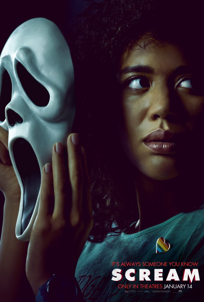 The nine new character posters serve as an introduction to the next generation of Scream characters: Sam Carpenter (Melissa Barrera), Tara Carpenter (Jenna Ortega), Liv McKenzie (Sonia Ammar), Judy Hicks (Marley Shelton), Amber Freeman (Mikey Madison), Chad Meeks-Martin (Mason Gooding), Mindy Meeks-Martin (Jasmin Savoy Brown), Richie Kirsch (Jack Quaid) and Wes Hicks (Dylan Minnette).